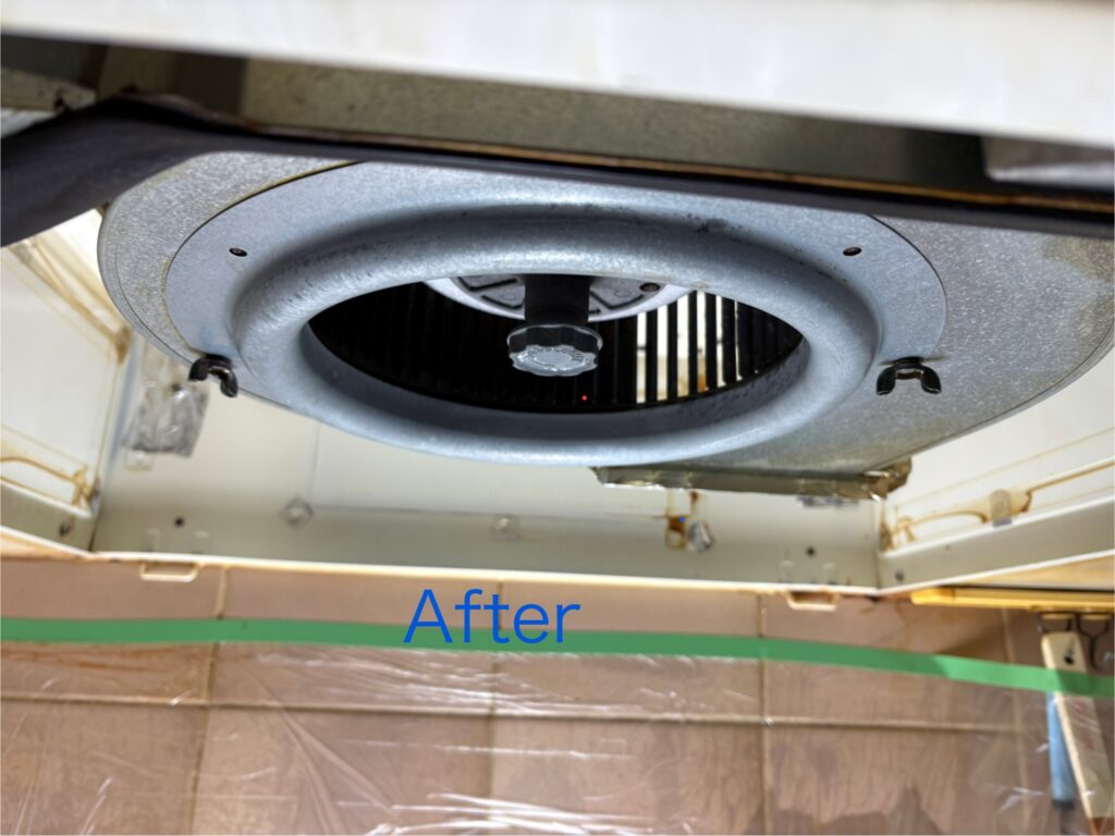キッチンレンジフードの清掃依頼に伺い、施工させていただきました。非常に汚れていたため、気になってバスルームとトイレの換気扇の状態も見せていただいたところ、換気扇の汚れや周辺のカビ、ホコリの付着がひどい状態でした。キッチンのレンジフードの吸い込みが悪いと、バスルームやトイレの換気扇に影響を及ぼし、換気扇周辺にカビやホコリが付着することを説明しましたが、お客様はキッチンのレンジフードの吸い込みが良くなったので「大丈夫」とおっしゃいました。そのため、バスルームとトイレの換気扇の清掃依頼はいただけませんでした。